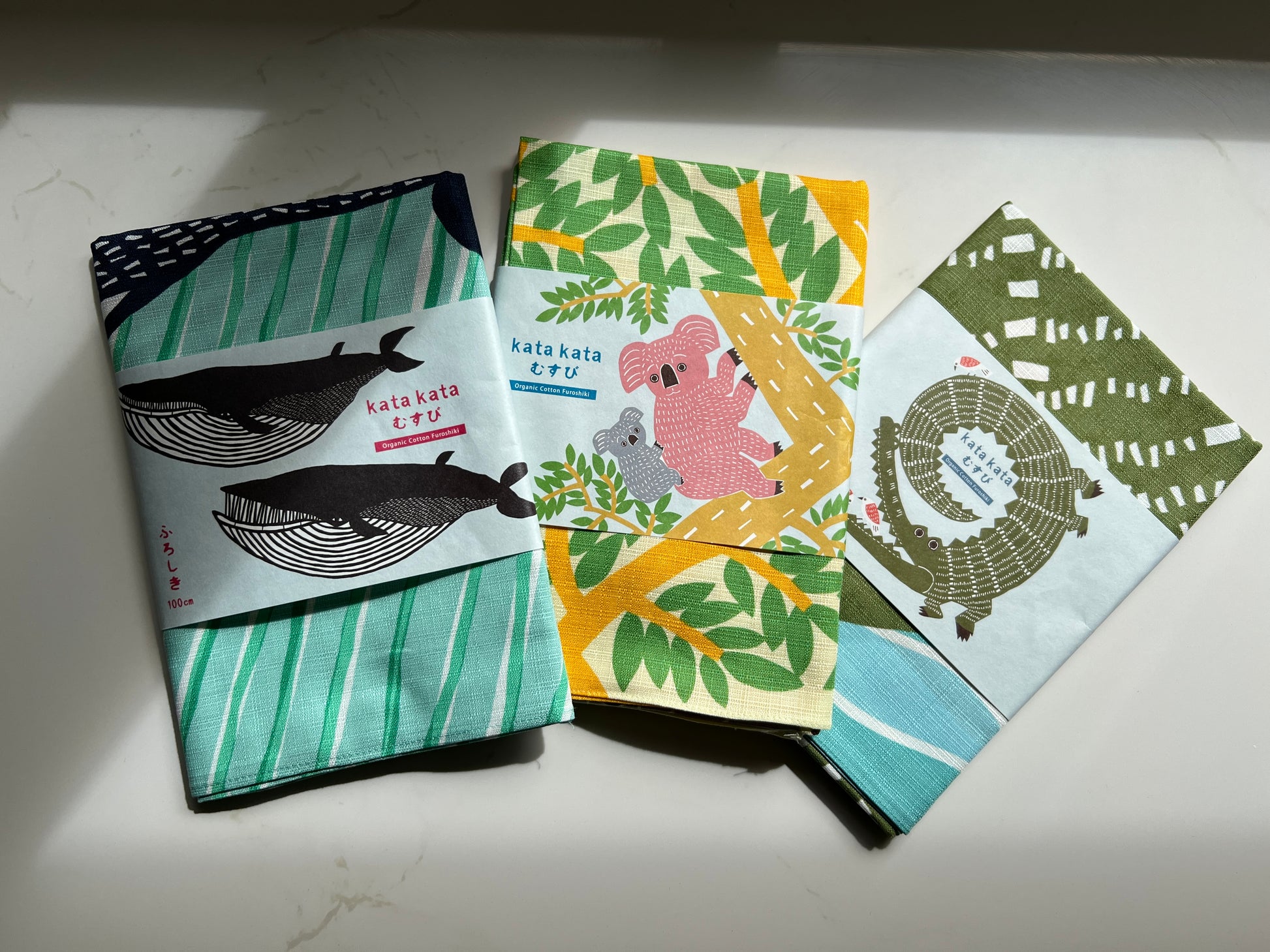 Kata Kata Furoshiki wraps are handmade and shipped directly from Japan. They are designed by Takeshi Matsunaga and Chie Takai from Kata kata, a creative team that designs original textile products using Katazome and Chusen print techniques. Their products and works have been displayed at several exhibitions.